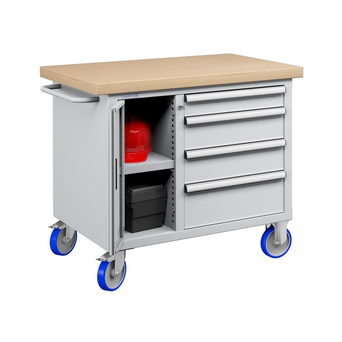 Carrello banco con ripiano in legno da 40mm con cassetti e ripiano chiuso da anta