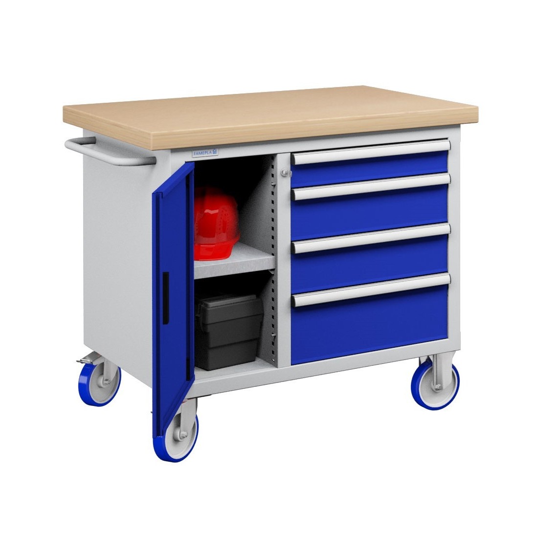 Carrello banco con ripiano in legno da 40mm con cassetti e ripiano chiuso da anta
