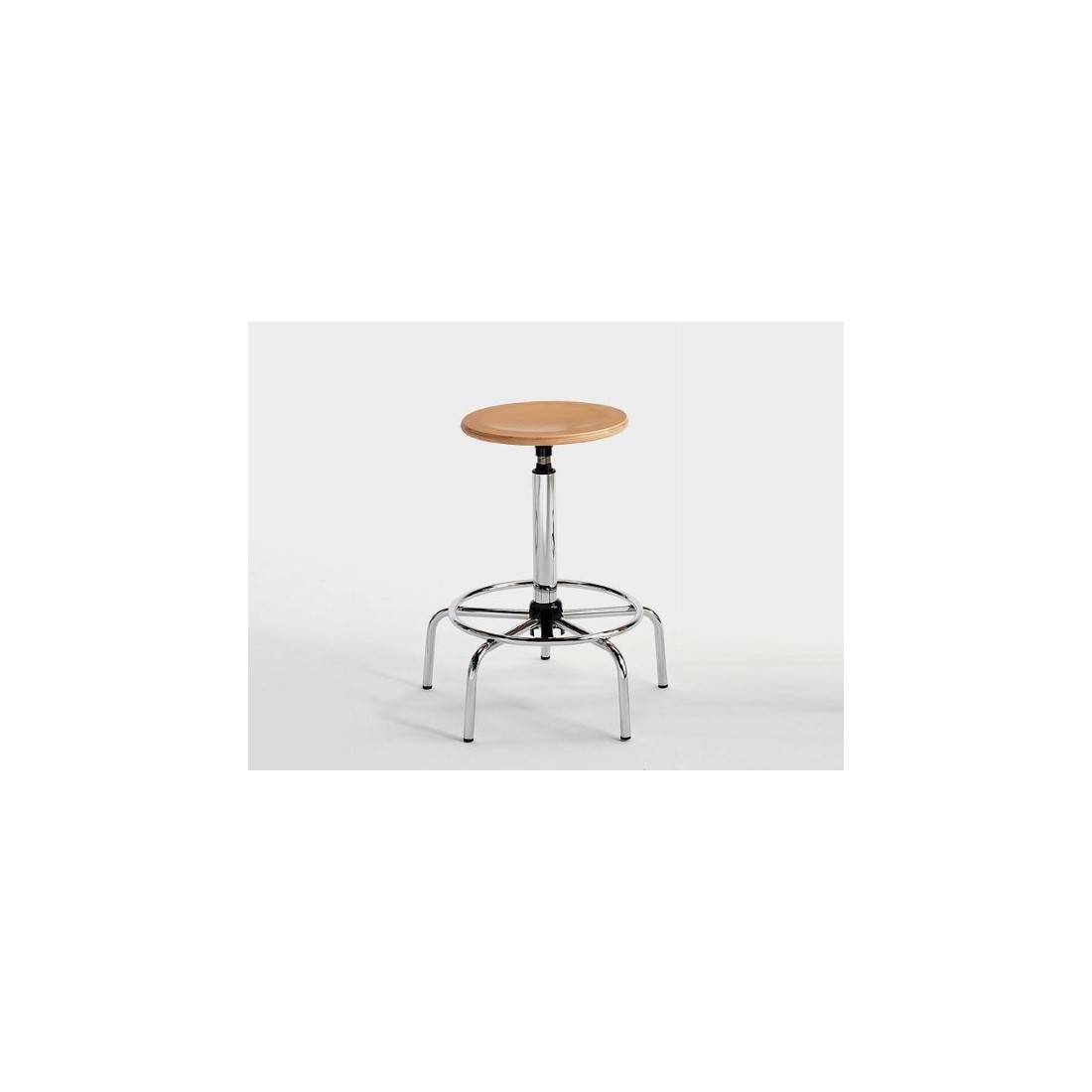 Sgabello con seduta e schienale in faggio, elevazione a vite o gas, base con poggiapiedi integrato in acciaio cromato.