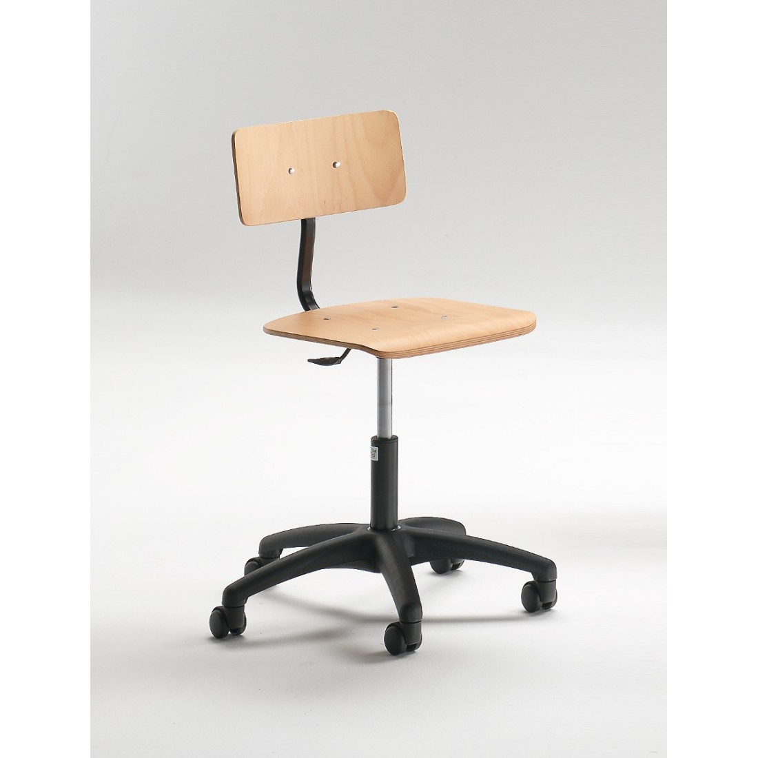 Sedie disegnatore di tipo Classico, regolabili in altezza con pistone pneumatico. Struttura in acciaio cromata o verniciata, su ruote. Seduta in faggio verniciato naturale, oppure imbottita e rivestita in tessuto. Schienale regolabile in altezza e in profondità.