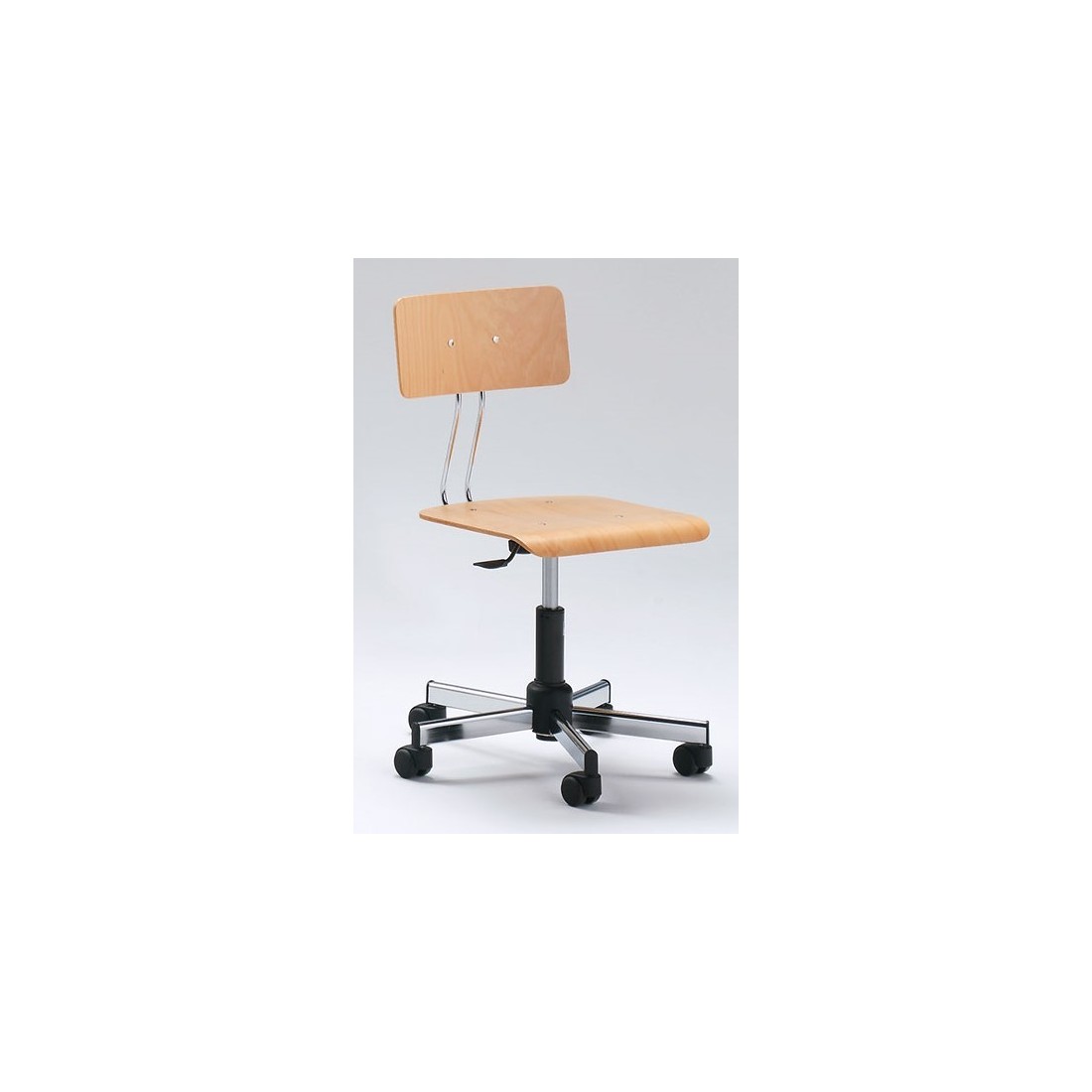 Sedie disegnatore di tipo Classico, regolabili in altezza con pistone pneumatico. Struttura in acciaio cromata o verniciata, su ruote. Seduta in faggio verniciato naturale, oppure imbottita e rivestita in tessuto. Schienale regolabile in altezza e in profondità.